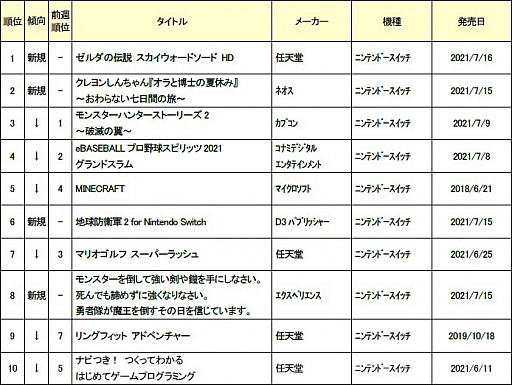 今週は、新作が多くランクインしており、1位はSwitch「ゼルダの伝説 スカイウォードソード HD」が獲得しました。本作は10年前に発売されたWii版のリマスター版となっており、未プレイの人からファンの人まで幅広い層に支持されています。また、同時発売のamiiboやオリジナルモデルのJoy-Conも好評です。