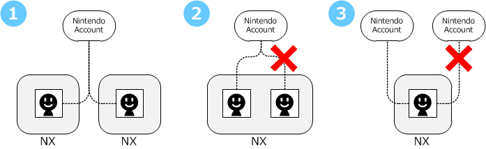 ② 1つのニンテンドーアカウントで一デバイスの複数のユーザーアカウントには紐付けできない