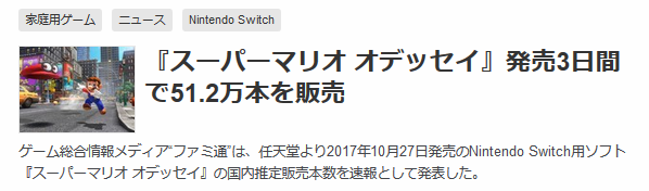 Switch スーパーマリオオデッセイ 初週51万本 ※ファミ通