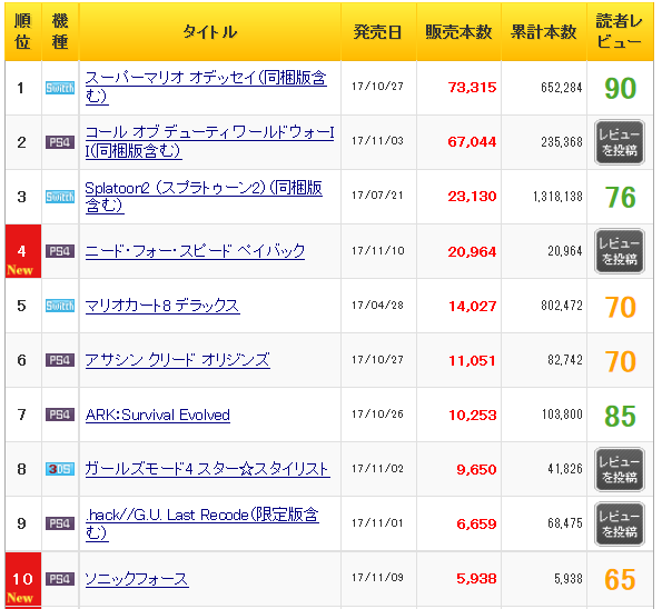 『スーパーマリオ オデッセイ』に次ぐ2位になるなど、予想を遥かに超える