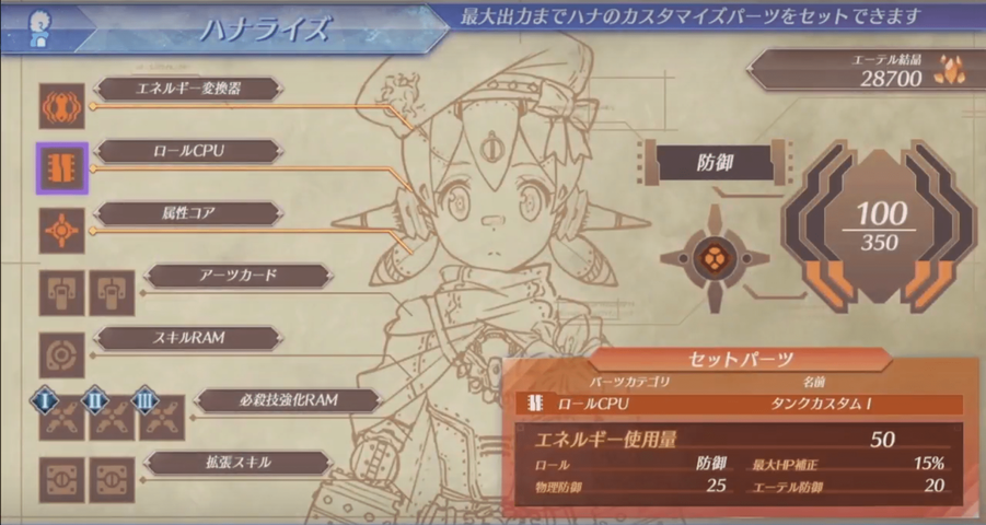 基本はエーテル結晶を集めてハナのカスタマイズでパーツ作成して装備