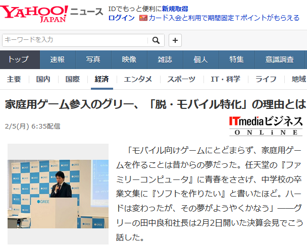 グリーの田中良和社長は2月2日開いた決算会見でこう話した。